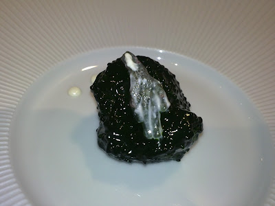 Se trata de un pan con intenso sabor a mar, como a mejillón pero mucho mas intenso, delicioso. Como decíamos, en Aponiente uno literalmente "se come el mar". Ambos camareros nos sirvieron todos y cada uno de los platos exactamente a la vez a los dos comensales sentados a la mesa, sincronizados perfectamente.